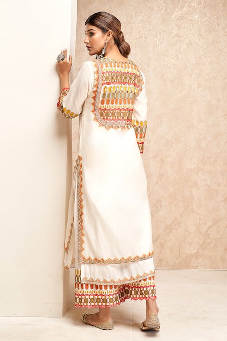 White and yellow chanderi kurta featuring thread embroidery in geometric pattern with scallop trimmed three-quarter sleeves. Paired with an inner, pant, and embroidered dupatta measuring 2.5 meters.