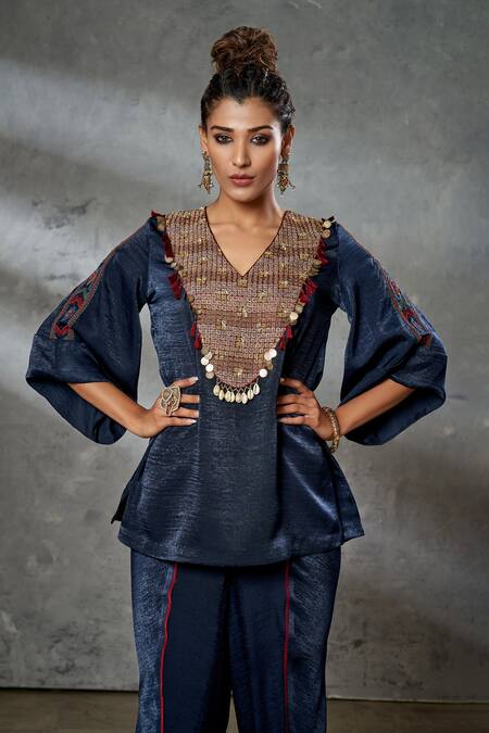 Navy blue silk suede tunic with V neck, balloon sleeves, bead, sequin & thread aari hand embroidery. Paired with dhoti pants with contrast border.
