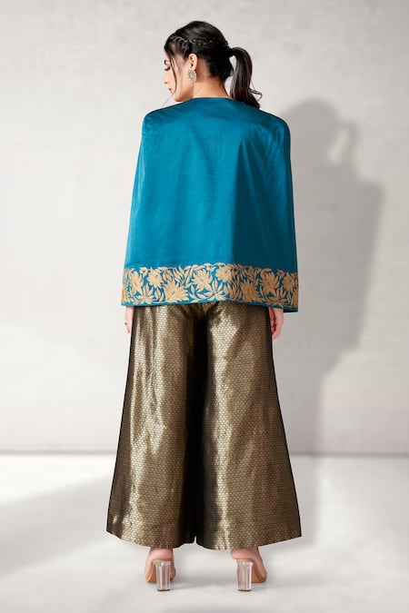 Buy_Aditi Somani_Blue Brocade, Satin, Linen Embroidery Open Floral Bloom Aari Jacket And Pant Set _Online_at_Aza_Fashions
