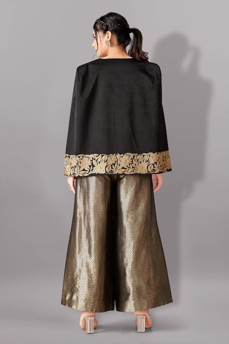 Black jacket featuring split sleeves and intricate floral aari embroidery. Paired with a matching inner bustier and wide-legged pant adorned with woven brocade motifs.