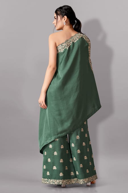Green Silk Embroidery One Shoulder Gara Kurta With Flared Pant