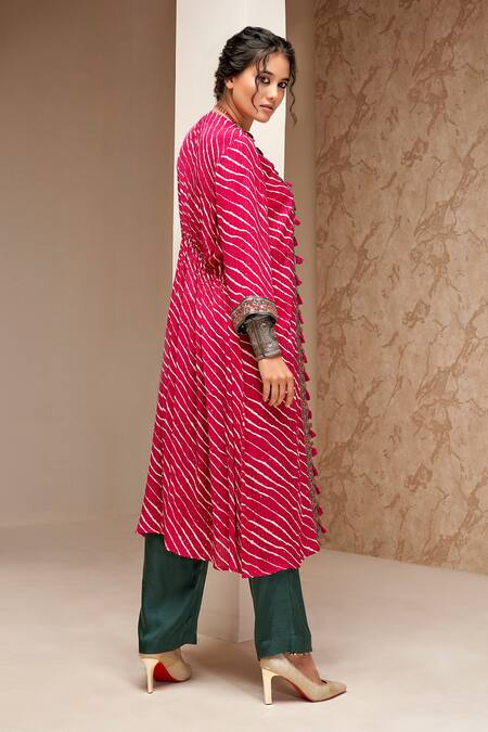 Green and pink embroidered kurta featuring a round neckline and sleeveless design. Paired with a candy red leheriya cape with three-quarter sleeves and geometric floral aari work, along with coordinating pants.