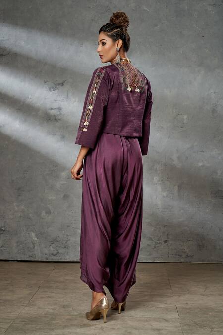 Wine silk suede jumpsuit with pleated drapes, V neck, asymmetric hem & attached tasselled tie-up belt. Paired with modal satin jacket with all over sequin, thread & bead embroidery.