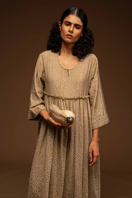 Buy_Aditya Sikand_Beige 30% Silk Handwoven, 70% Organic Cotton Round Embroidered Dress_Online_at_Aza_Fashions