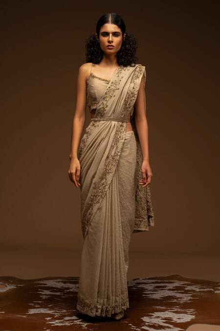 Beige saree with heavy embroidered border and pallu. Comes with spaghetti strap blouse and thin belt.
