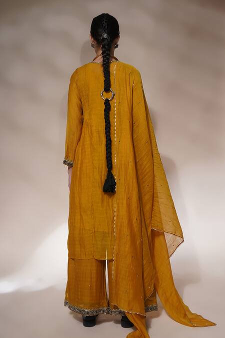 Mustard yellow handwoven A-line kurta with side pleated panels, sequin, thread, gota hand embroidered sleeves & placket. Paired with palazzo, sequin embroidered dupatta & inner slip.
