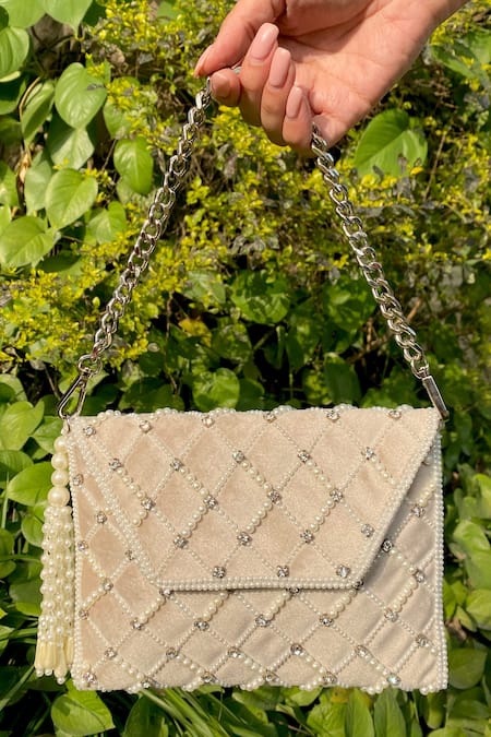 Beaded tassels on the sides, Geometric crisscross pattern of pearls and stones