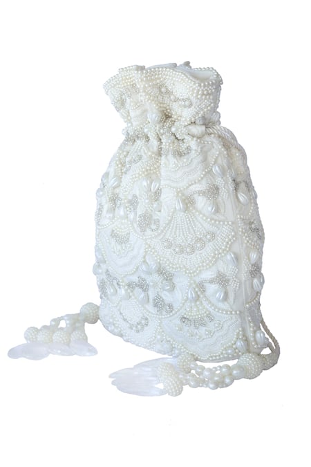 Beige potli bag featuring all-over scallop motif bead work and pearl embellishments
