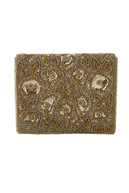 Gold clutch featuring floral sequin and bead embellishments with scallop edges