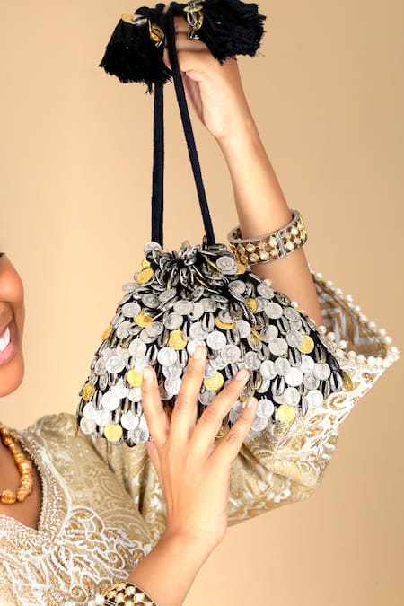 Buy_Adora By Ankita_Black Zari Gypsy Coin Flapper Potli Bag _at_Aza_Fashions