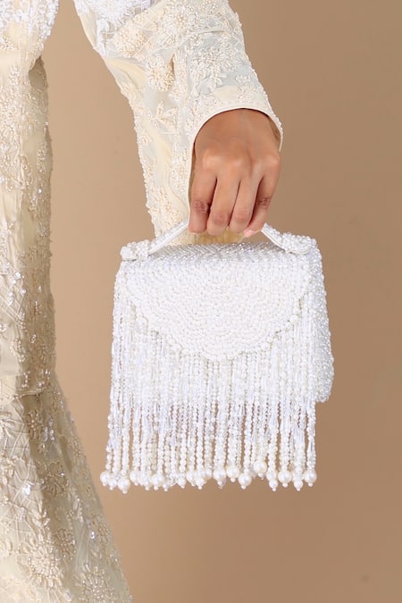 Buy_Adora By Ankita_Cream Pearls, Crystals Ivory Fringed Clutch Bag _at_Aza_Fashions