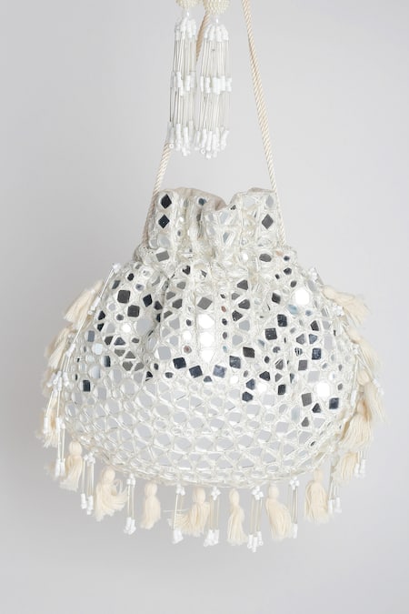 White potli bag featuring intricate thread and mirror work with beaded tassels