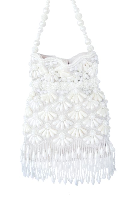 Beige potli bag featuring floral motif teardrop pearl work and multi-silver bead tassels