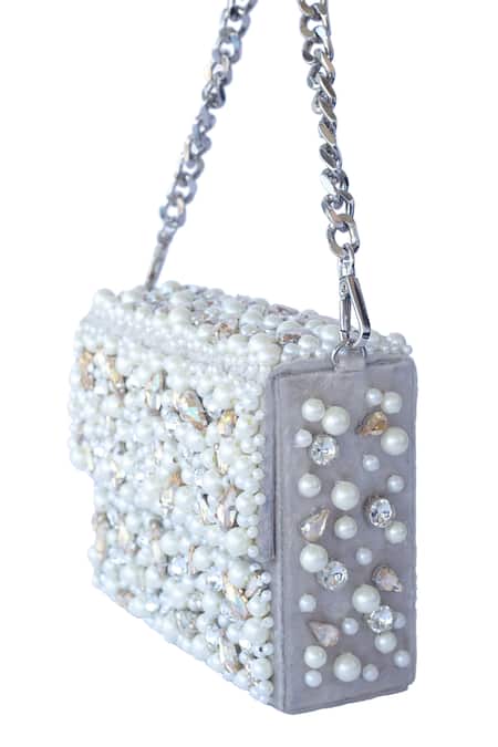 Embellished with stones, crystals & pearls, Detachable chain sling for versatility, Unique rectangle shape with flap closure