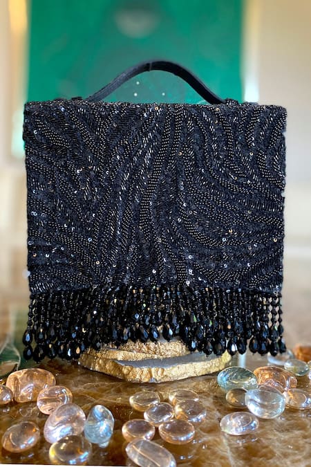 Black box clutch featuring all-over sequin and bead embellishments
