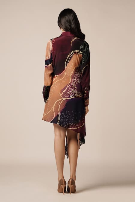 Purple high low asymmetric dress featuring all over abstract geometric prints