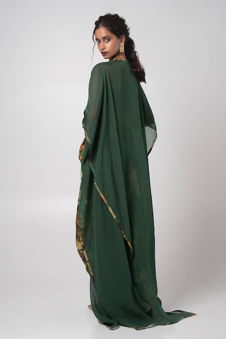 Green embroidered cape featuring batwing sleeves with printed borders. Paired with a sequin-cutdana embellished padded bustier and a verve printed pleated dhoti pant.