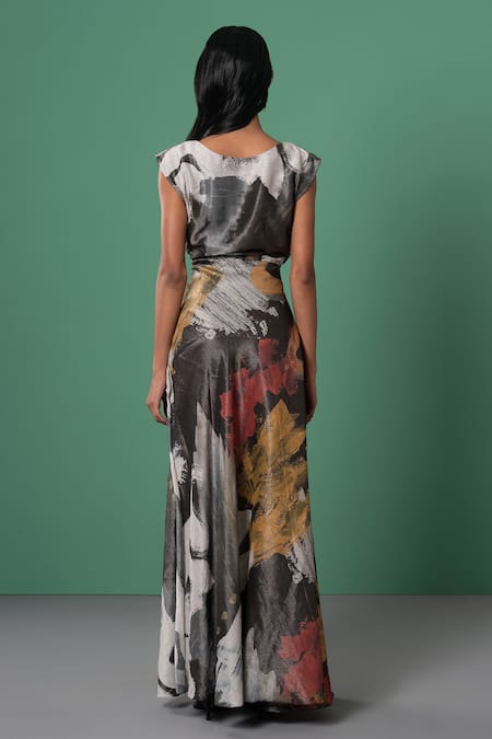 Multi Color Linen, Satin Round Neck Galaxy Print Maxi Dress