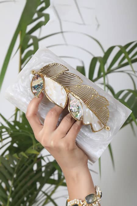 White clutch featuring mother of pearl and abalone shell work with a leaf-shaped knuckle handle