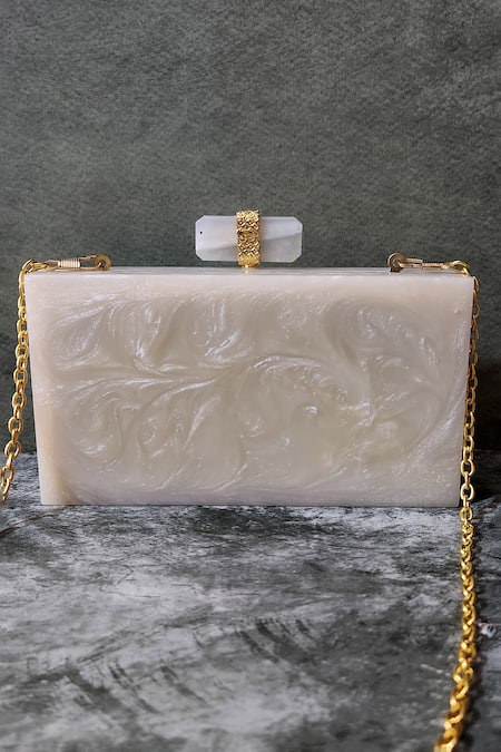 White resin clutch featuring gold toned mandala carved embellishments