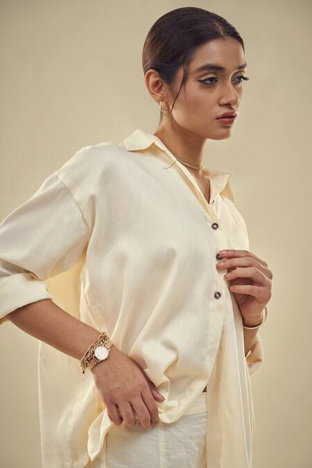Off white button down shirt in cotton satin with a collared neckline and long sleeves. Paired with a triangular hem trouser for a relaxed fit.