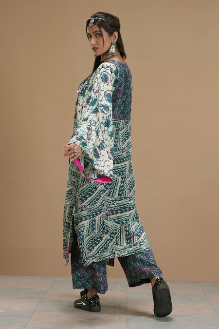Green flared sleeve abstract print kurta, elevated with sequin embellished placket. Paired with palazzo.