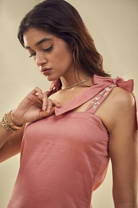 Mauve pink dress featuring a frilled hem and tie-up shoulder straps