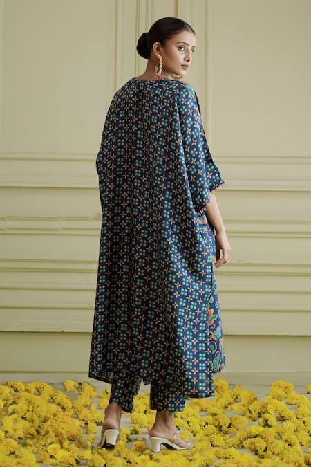 Blue russian silk kaftan with paisley jaal print, including sequins and glass beaded hand embroidery. Comes with narrow pant and an inner.