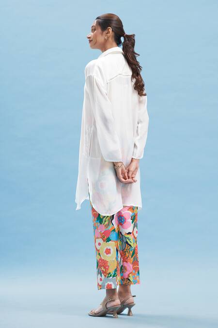 White kimono kurta featuring a collared neckline and fringe details. Paired with a multicolored floral printed pant and an inner, designed for a relaxed fit.