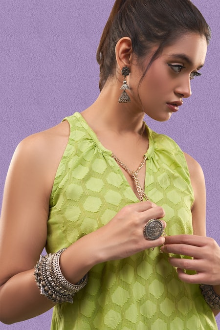Green kurta featuring a halter neck and textured pattern with chain detailing. Paired with matching pants that have an elasticated waistband.