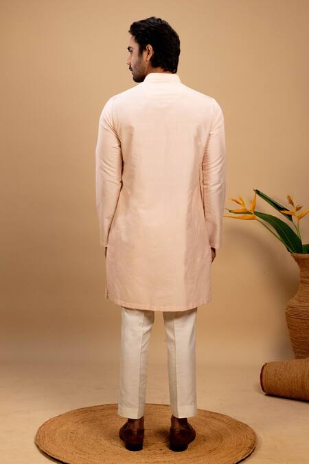 Peach kurta featuring tonal cord applique detailing and a stand collar. Paired with a straight fit trouser.