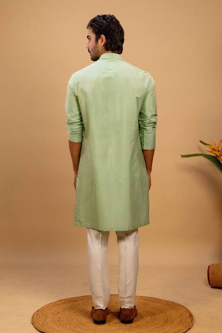 Green button down achkan style kurta featuring a geometric motif created using contrast green and printed fabric. Paired with off white trouser for a complete look.