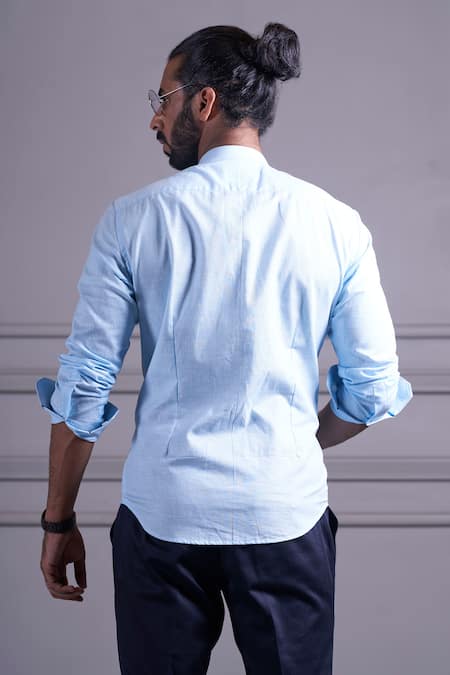 Sky blue linen shirt with mandarin collar and white criss-cross design in front.
