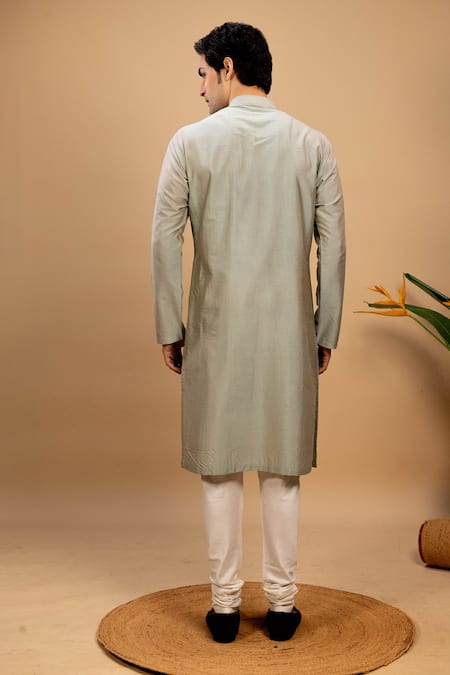 Green kurta featuring a vertical pintuck pattern and a stand collar. Paired with a churidar for a complete look.