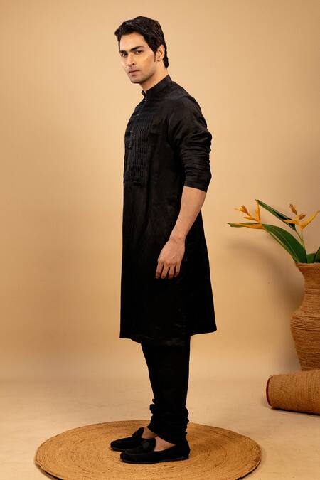 Black kurta featuring a pintuck detailed satin yoke and long sleeves. Paired with a matching churidar crafted from cotton fabric.