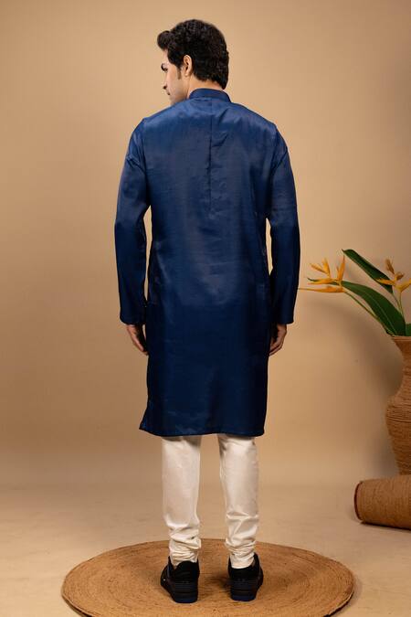 Blue silk kurta featuring diamond applique work on the hem. Paired with a churidar for a complete look.