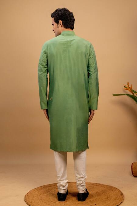 Green cotton silk kurta featuring pleated panels on the side. Paired with an off white churidar.