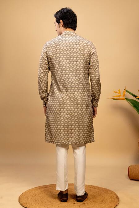Brown printed kurta featuring a band collar and long sleeves in muslin fabric. Paired with beige trousers for a complete look.