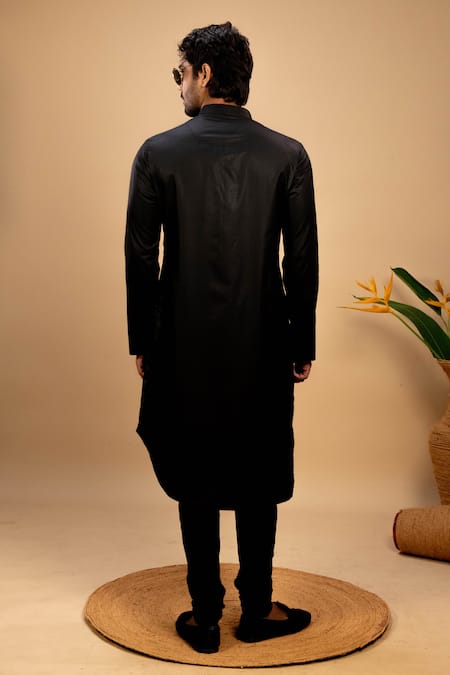 Black silk kurta featuring an asymmetric hemline and full sleeves. Paired with a matching churidar for a complete look.