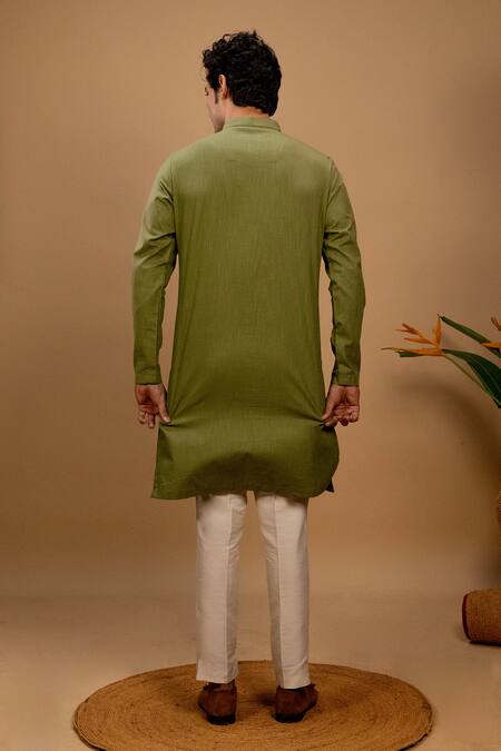 Green silk kurta featuring a band collar and long sleeves with quilt embroidery around the placket. Paired with a beige trouser for a complete look.