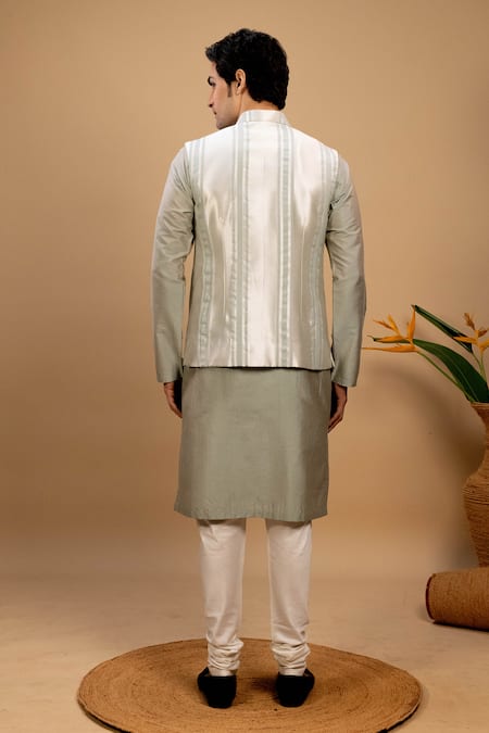 Silver bundi featuring a vertical pintuck pattern with a stand collar. Paired with a matching kurta and churidar in suiting and cotton silk fabric.