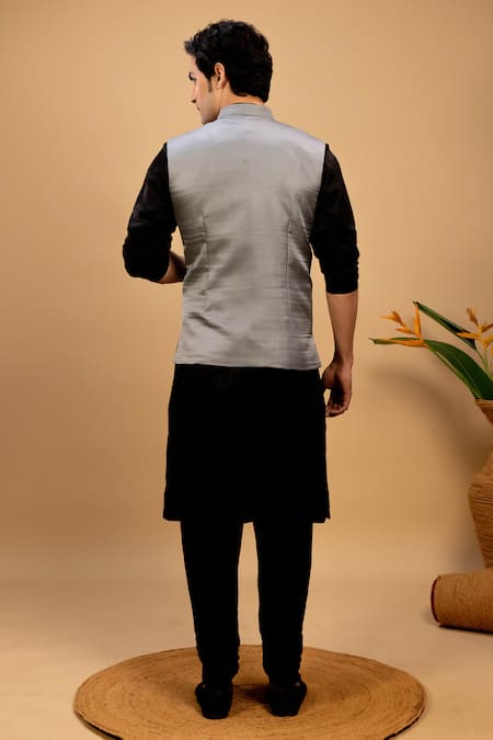 Black cotton satin long kurta featuring a pintucked yoke. Paired with a grey bundi adorned with black thread quilting and churidar in muslin base.