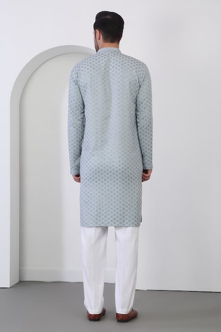 Mint blue kurta featuring tonal thread sequin embroidered checkered patterns with side pockets. Paired with matching front button closure pant.