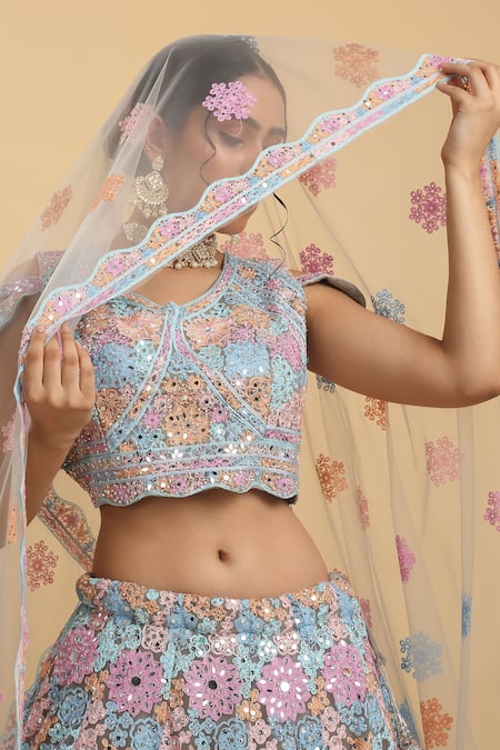 Multi color lehenga featuring all over floral pattern with mirror, thread, sequin & stone work. Paired with embroidered padded blouse and scallop bordered dupatta.