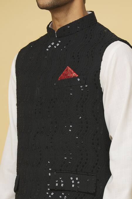 Black nehru jacket featuring sequin embroidery and a concealed placket