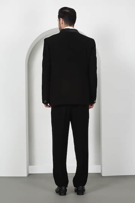 Black tuxedo featuring cutdana, thread, and bead embroidery in bloom placement pattern. Paired with a white shirt, waistcoat, pant, and bow tie.