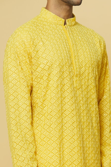 Yellow kurta featuring floral embroidery, side slits, and a mandarin collar. Paired with a matching pyjama for a complete look.