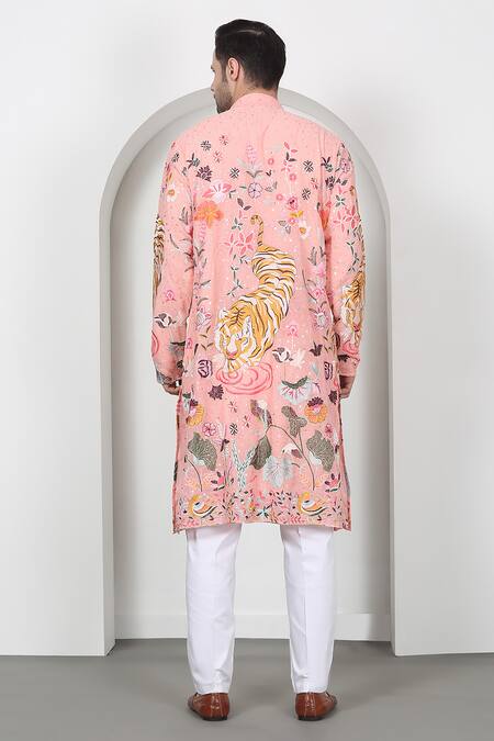 Coral kurta featuring dori and sequin embroidery with forest and tiger motifs. Paired with a contrast pant and matching dupatta.