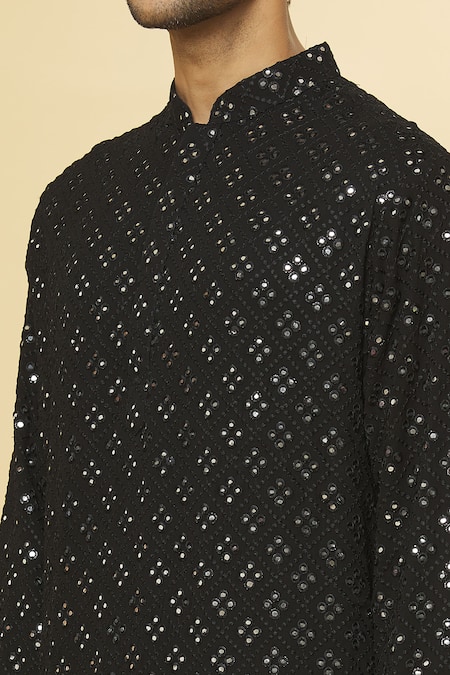 Black kurta featuring mirror embroidery, mandarin collar, and full sleeves. Paired with a matching pyjama, this set offers a relaxed fit and concealed placket detailing.