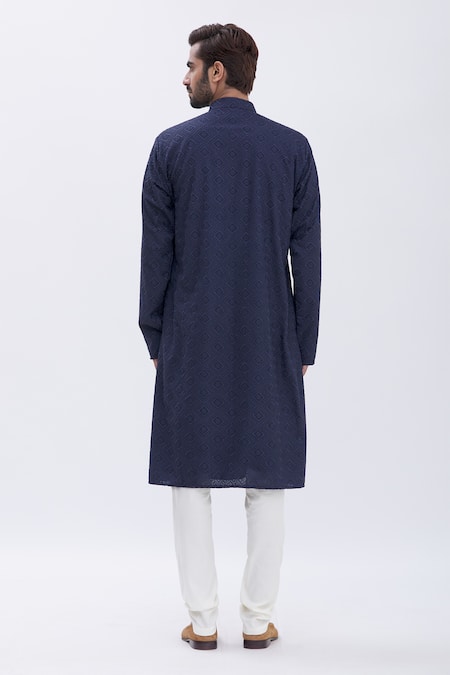 Dark navy blue kurta featuring all-over embroidered motifs. Paired with a pyjama.